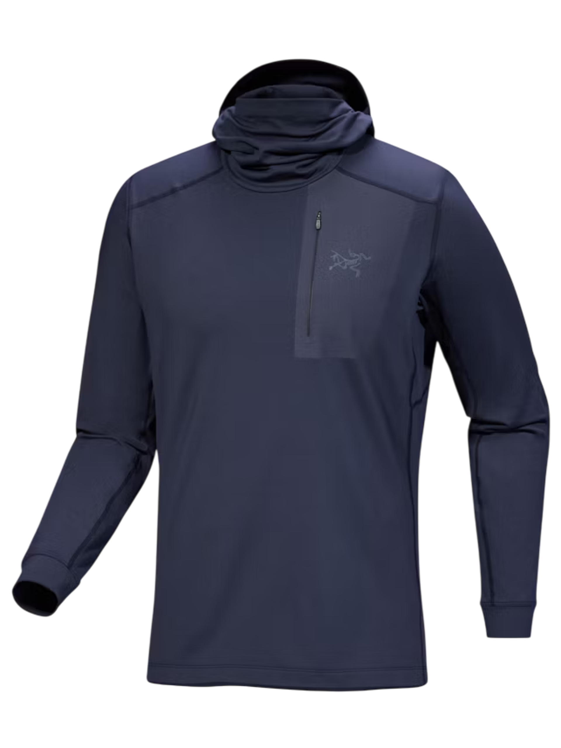 Lightweight, trim fitting hooded base layer for lower output activities in cool temperatures.